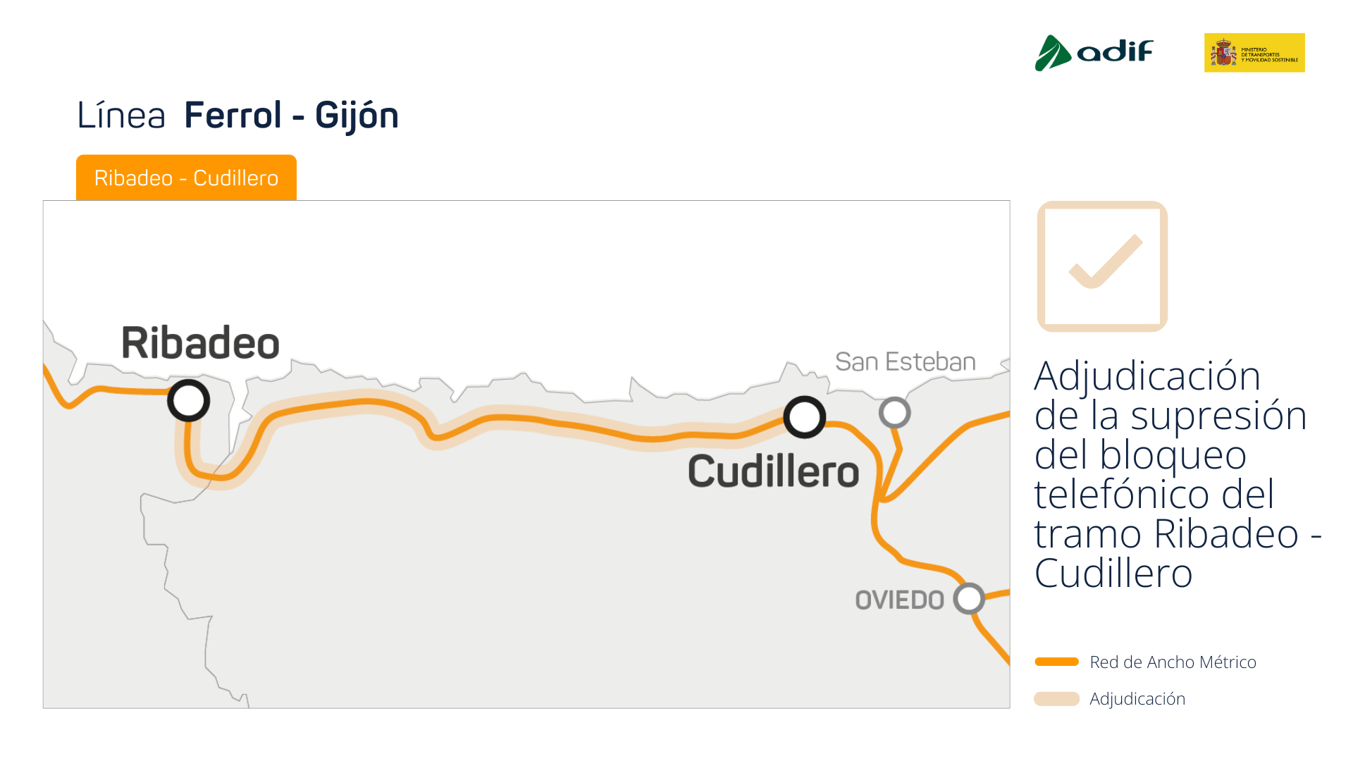 El contrato comprende la redacción del proyecto constructivo, la ejecución de las obras, las pruebas y puesta en servicio de las instalaciones de seguridad correspondientes a la supresión del bloqueo telefónico a lo largo de este tramo de 110 km, que discurre entre Ribadeo (Lugo) y Cudillero (Asturias).