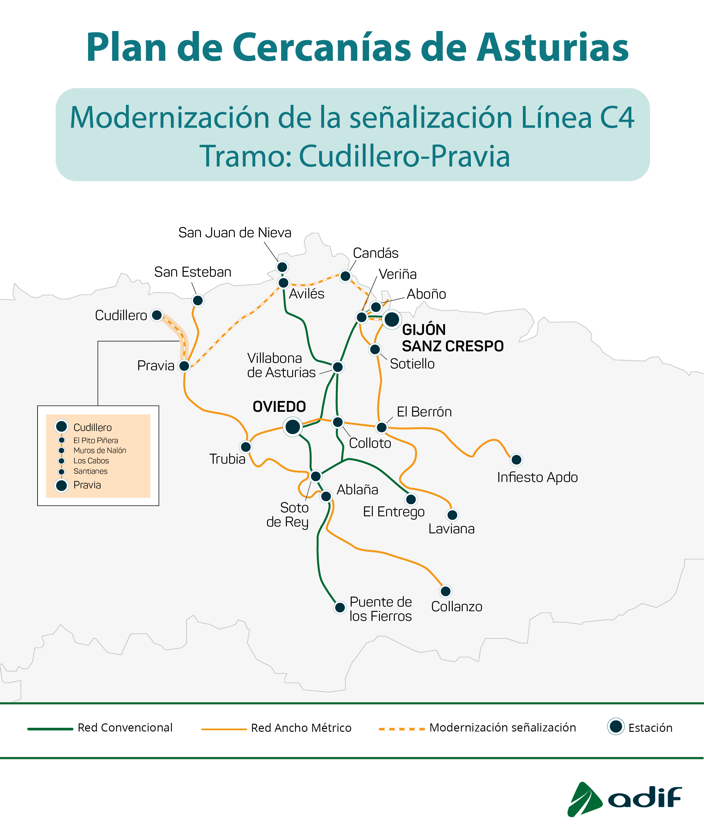Adif da un nuevo impulso al Plan de Cercanías de Asturias con la movilización de una inversión de 18,2 millones de euros en la modernización de la señalización del tramo Cudillero-Pravia, en la línea de ancho métrico C4 Gijón-Cudillero.
