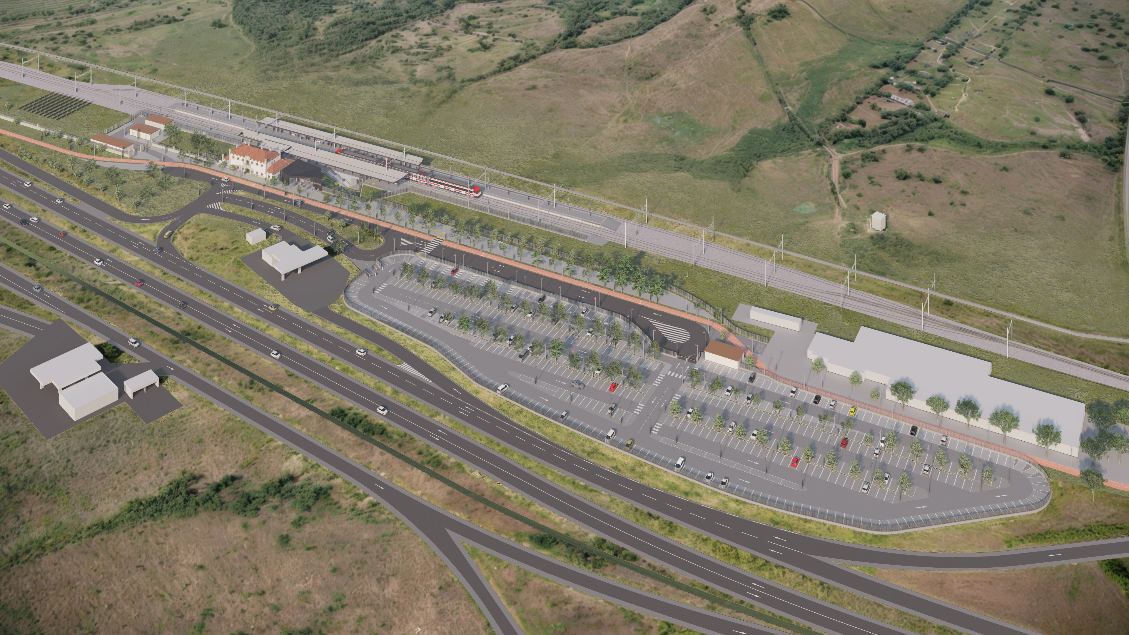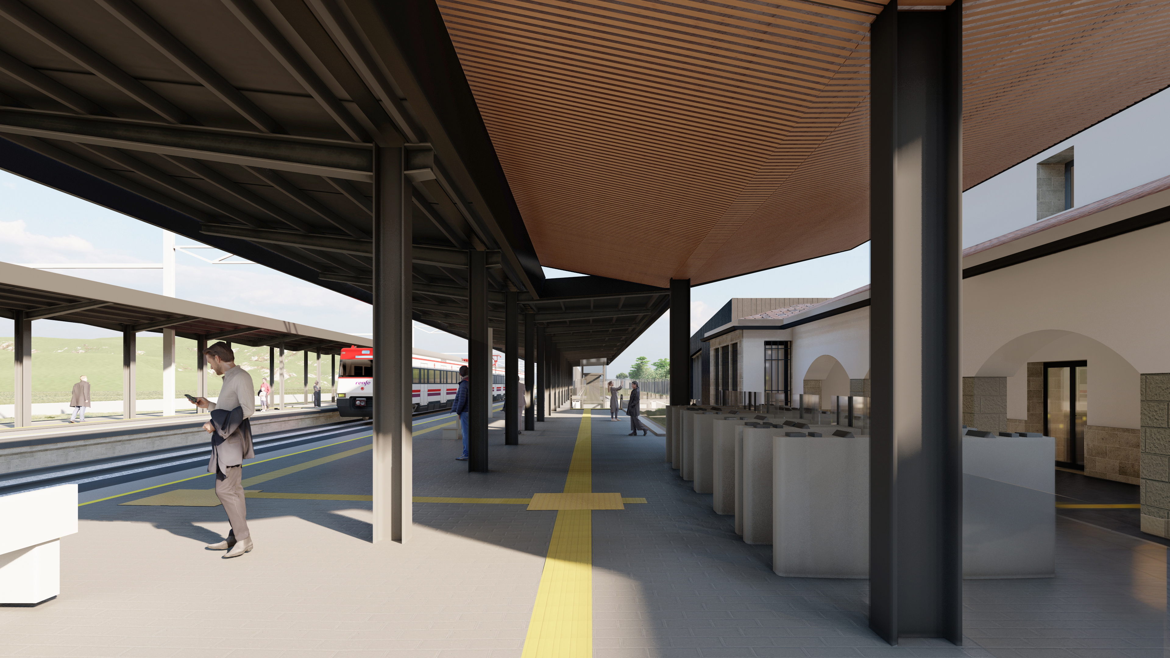Cafetería, aparcamiento y carril bici Al norte de este edificio histórico se construirá uno nuevo, de 155,8m2, destinado a restauración, y al sur, otros dos pequeños edículos para instalaciones técnicas. Asimismo, se completarán los dos andenes de la estación, instalando marquesinas (cubrirán 80m de sus 240m) y conectándolos con un paso inferior dotado de escaleras y ascensores.