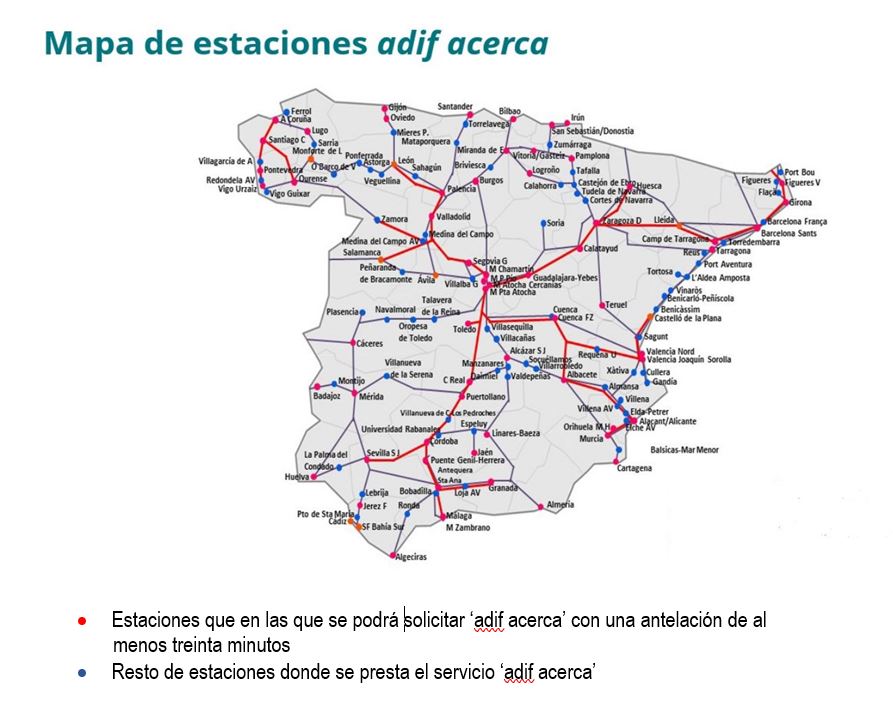 El servicio ‘adif acerca’ se presta en un total de 141 estaciones con tráficos de trenes de alta velocidad, larga distancia y media distancia repartidas por todo el país. En las 72 estaciones restantes, que en conjunto contabilizan alrededor del 17% de solicitudes de asistencia, el plazo para solicitarlo se mantiene en al menos doce horas antes de la salida del tren.