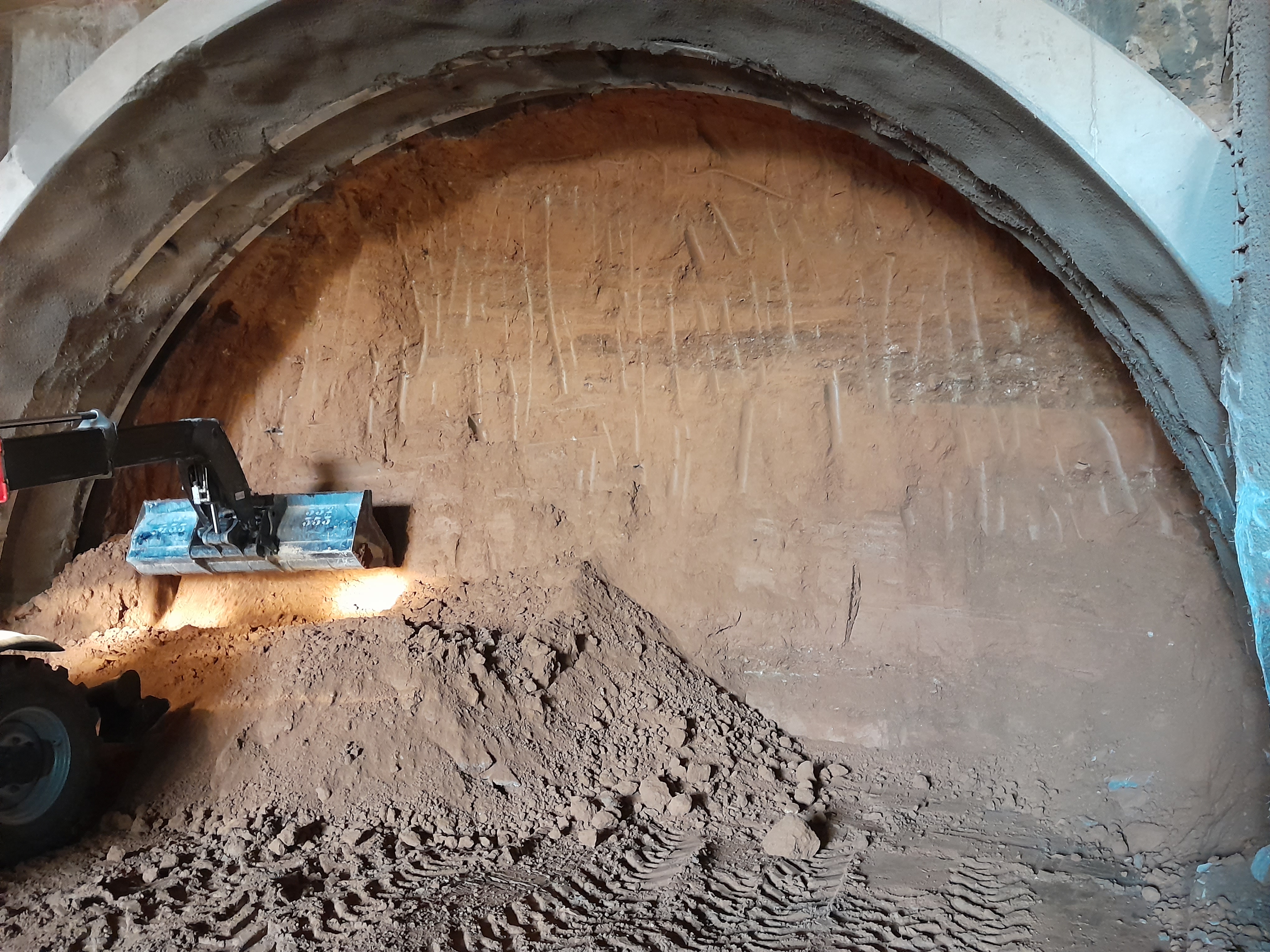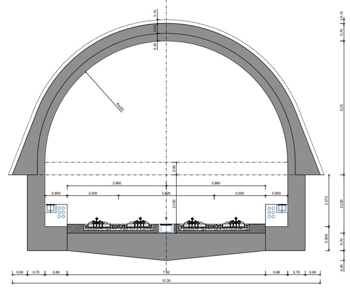 El túnel se ha proyectado con dos sostenimientos diferentes en función de los materiales, compuestos por capas de 40 cm de hormigón proyectado, cerchas, micropilotes subverticales y anclajes.