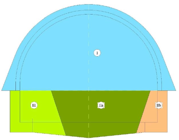 Para la ejecución del túnel, en primer lugar, se excava el avance (zona I, en azul en el esquema procedimiento constructivo adjunto) y se ejecuta su sostenimiento. A continuación, se excava la parte inferior, conocida como destroza (IIa, IIb y III) en tres fases: primero, se excava la sección IIb (en color naranja en el esquema) y se ejecuta el hastial derecho; segundo, se excava la sección IIa (en verde oscuro); y, tercero, se excava la sección III (en verde claro) y se ejecuta el hastial izquierdo. A continuación, se ejecuta la solera o suelo del túnel, el revestimiento y finalmente se instala la vía en placa.