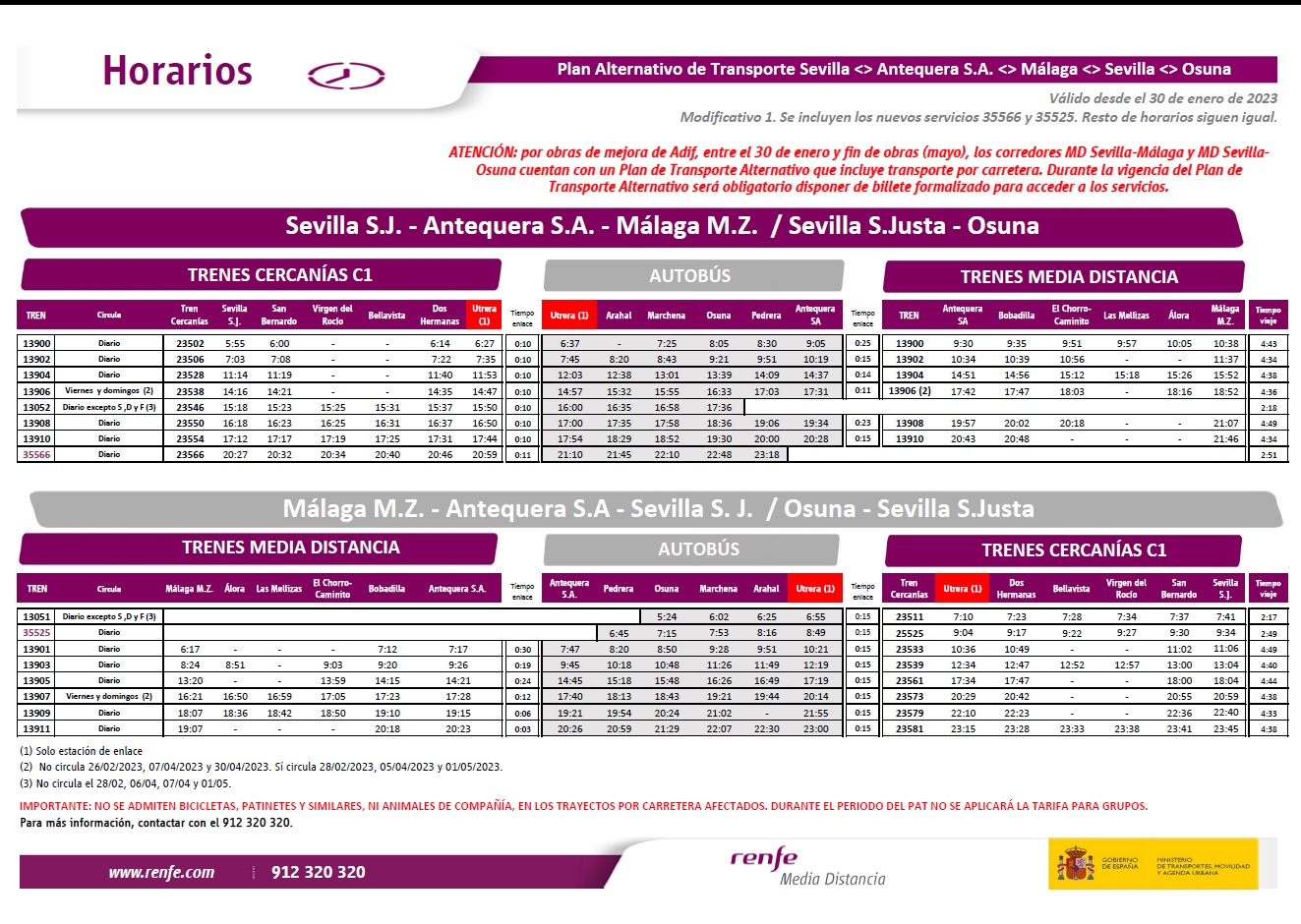 Para los trenes MD Sevilla-Málaga y estaciones intermedias, el servicio alternativo con dos transbordos consiste en que los viajeros realizarán en Cercanías el trayecto entre Sevilla Santa Justa y Utrera, se encaminarán en autobús desde Utrera hasta Antequera Santa Ana y continuarán el resto del recorrido en un tren MD hasta Málaga.