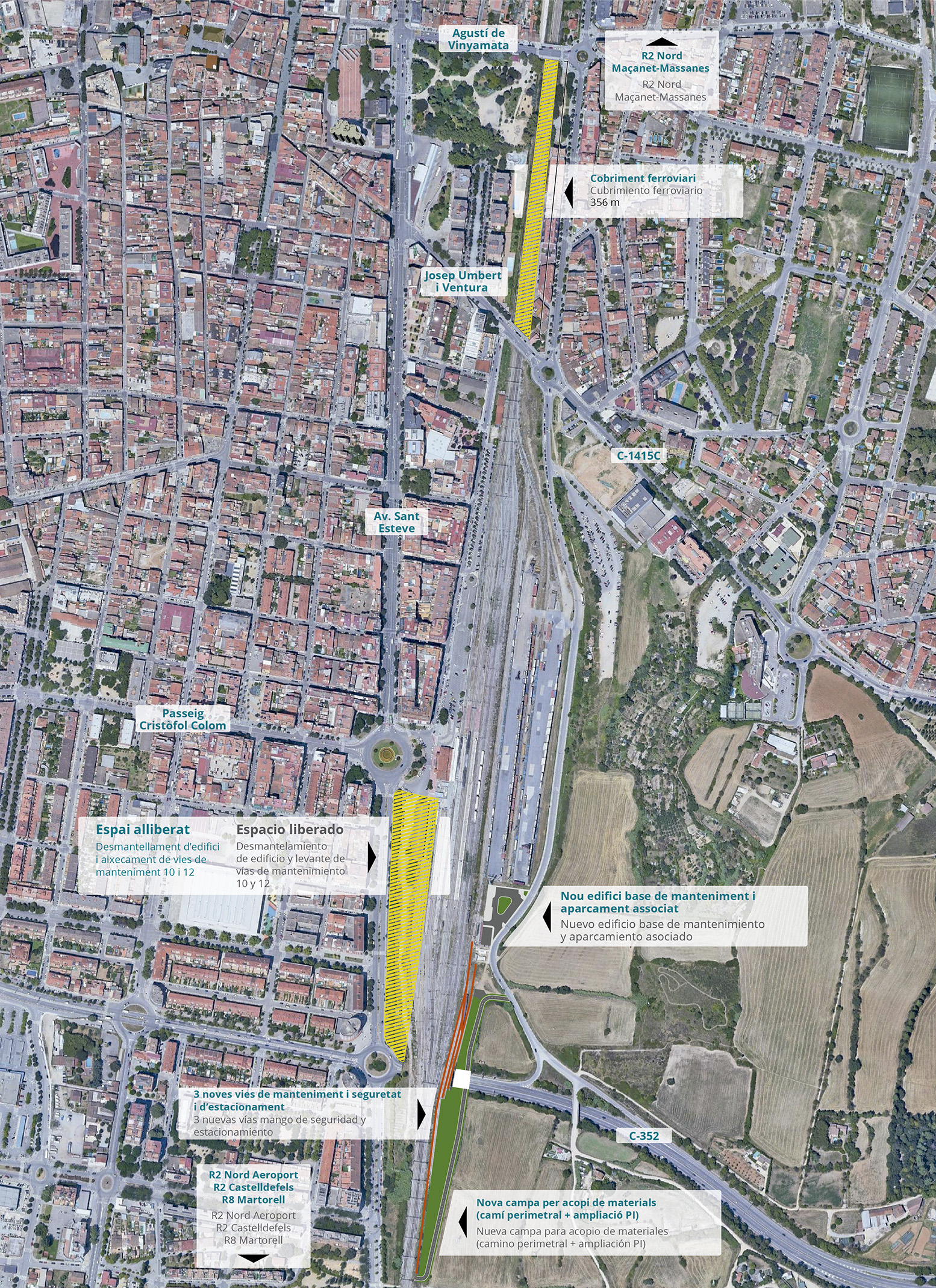 También se construirá un aparcamiento para vehículos y un camino lateral de 6 m de anchura, ambos destinados a servicios de mantenimiento, además de la instalación de un nuevo cerramiento y muro lateral y la ampliación del paso inferior existente bajo la playa de vías, que corresponde a la carretera C-352.