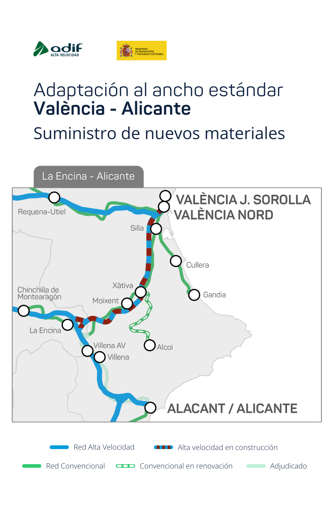 Adif ha licitado el contrato para el transporte y suministro de nuevos materiales de vía para la implantación del ancho estándar en el tramo La Encina-Bifurcación Alicante, actuación enmarcada en el desarrollo del Corredor Mediterráneo en la Comunitat Valenciana.