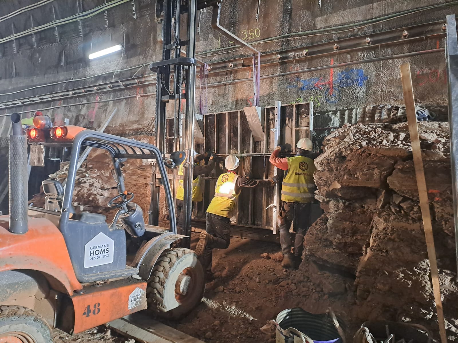 Asimismo, siguen los trabajos en el interior del túnel de Castellbisbal para la adaptación de su estructura y dimensiones al ancho internacional. Ya se ha concluido el rebaje de la rasante y se está ejecutando el respectivo recrecido de las parades laterales.