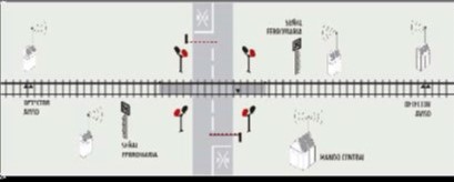 In its basic configuration, it is consists of two warning detectors, two railway protection signals, two automatic semi-barriers, acoustic and light signals, a track circuit, a reset detector and a set of five electrical cabinets where the information is processed.