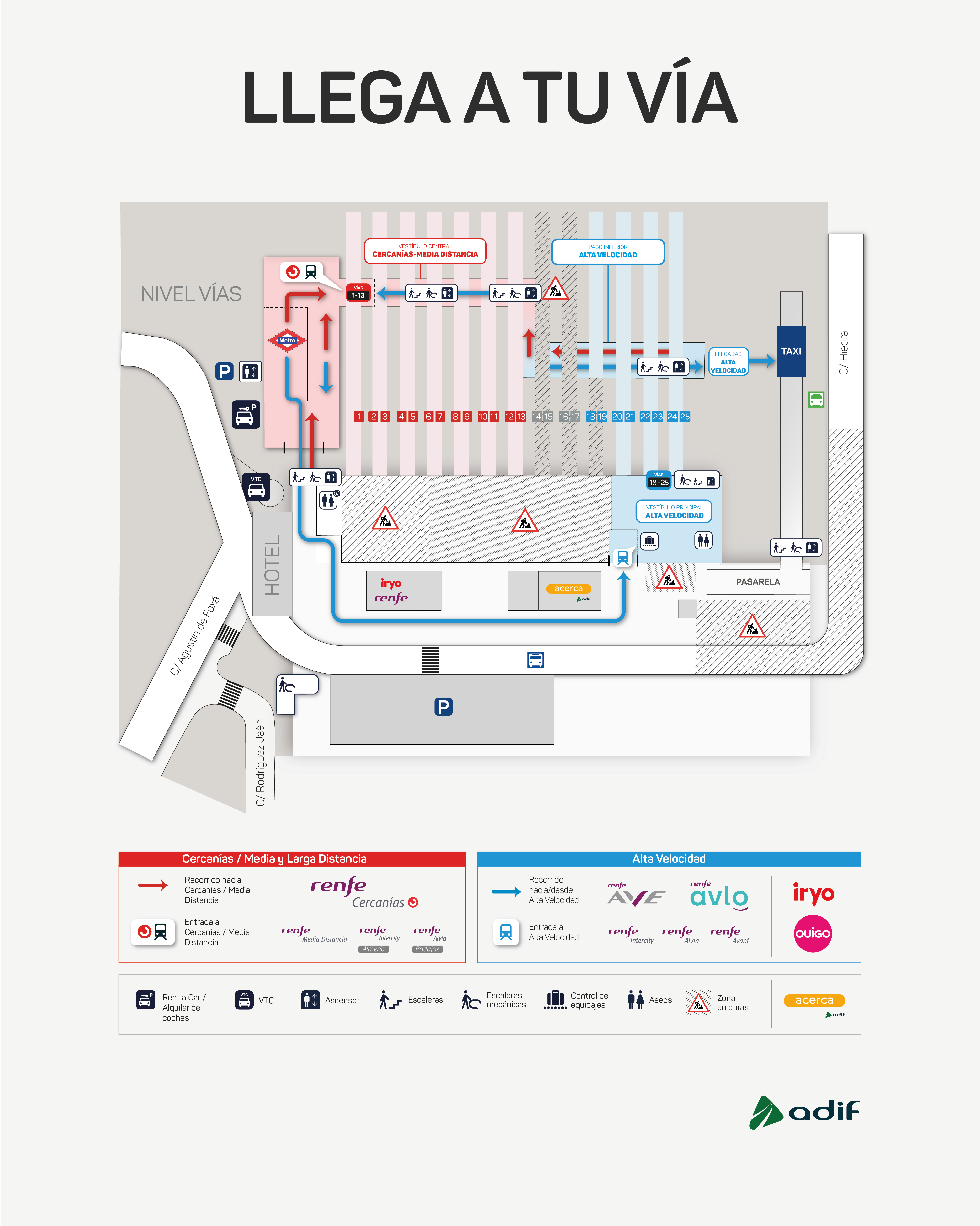 Infórmate en la estación y en nuestras redes sociales sobre los detalles de cómo llegar a tu tren de la forma más rápida. X: @infoAdif y @Adif_es, Instagram: adif_es; Facebook: Adif y Linkedin: Adif.