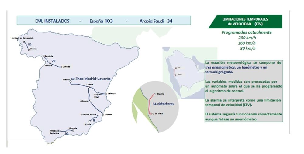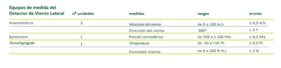 O Detector de Vento Lateral é un sistema que permite predicir a velocidade e a dirección do vento que afecta aos tráficos ferroviarios. En condicións meteorolóxicas adversas, determina os rangos de velocidade dos trens que garanten a súa seguridade. O sistema consiste nun conxunto de estacións meteorolóxicas para medir a velocidade e dirección do vento, a temperatura, a presión atmosférica e a humidade relativa; e por un algoritmo de control que procesa a información e establece as limitacións temporais de velocidade correspondentes.